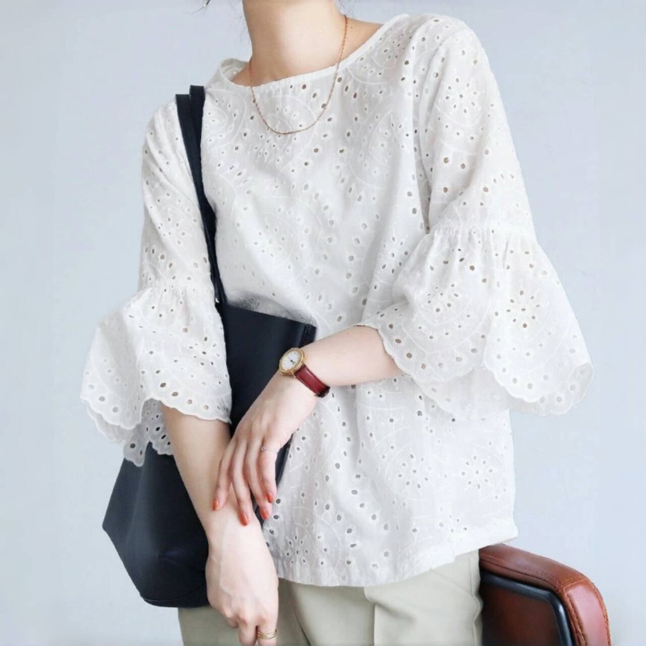 繊細なレースデザインが優雅さを添える半袖カットソーです。