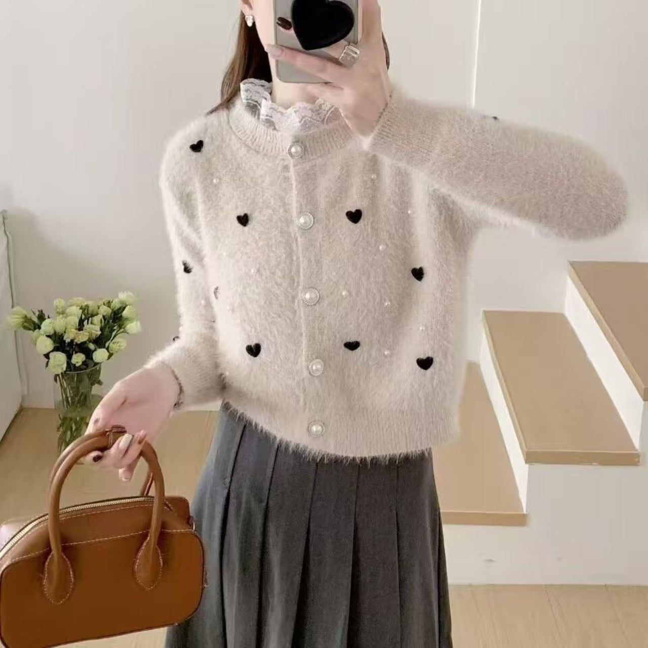 # ハート パール ニット カーディガン 韓国ファッション ベージュ 250597